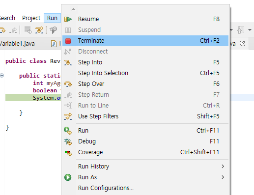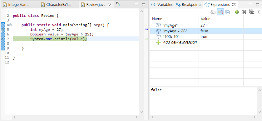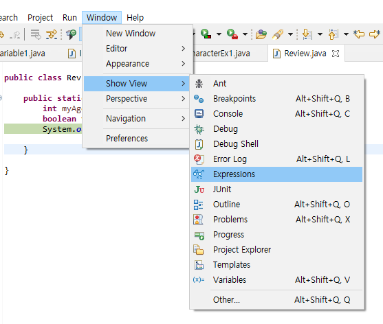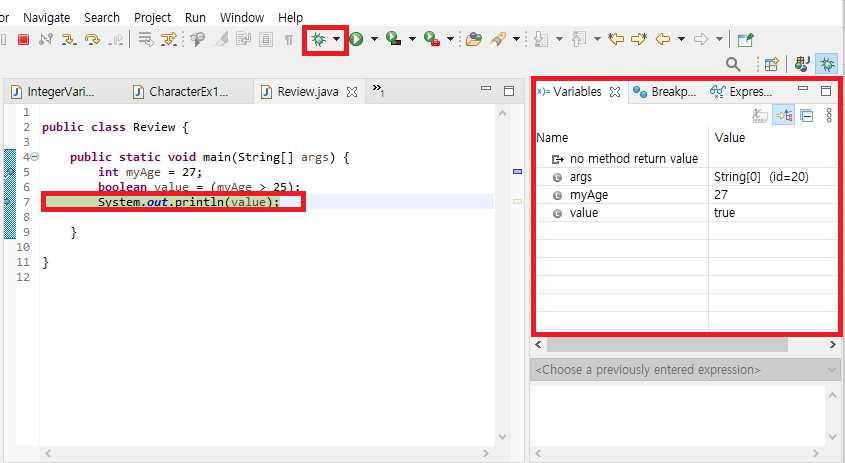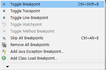 디버깅 할 코드에 커서 두고 Run - Toggle Breakpoint-Debug(F11) -Expressions- Terminate