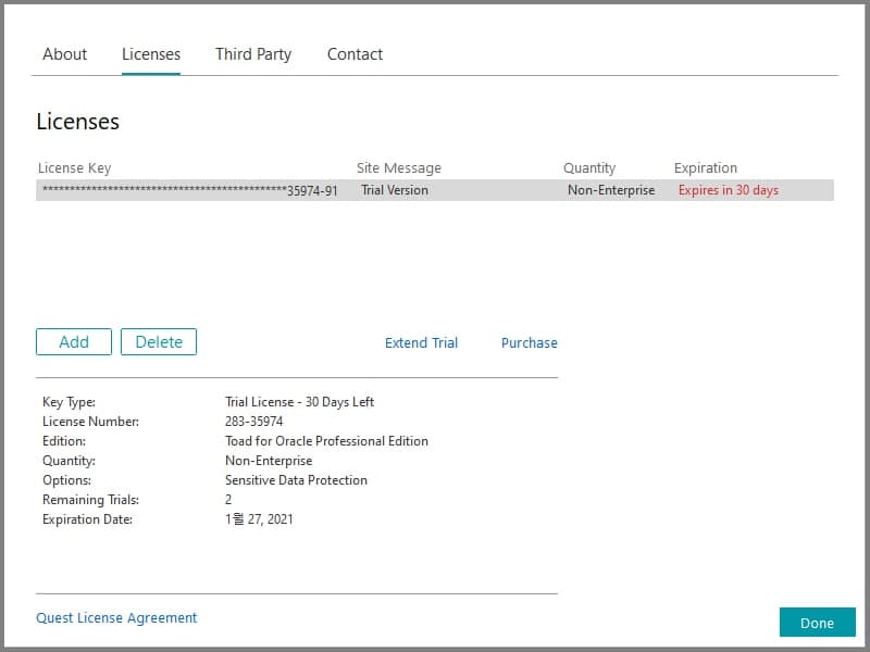 메일로 온 라이센스 키 번호 복붙해서 입력 add버튼 눌러서 라이센스 등록 PW : TIGER or tiger desc smp; +Ctrl +Enter